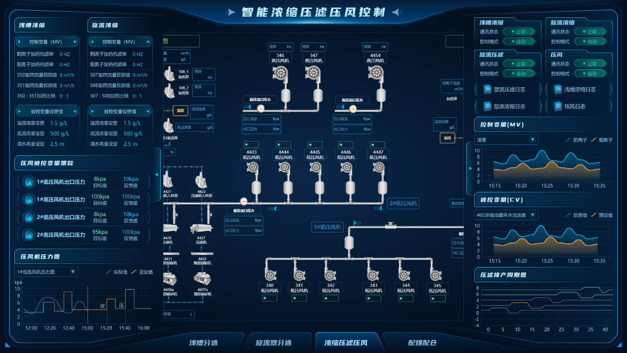 “數(shù)據(jù)-模型雙驅(qū)動(dòng)的選煤廠智能控制與決策系統(tǒng)的研究與應(yīng)用”項(xiàng)目研發(fā)了“數(shù)據(jù)-模型雙驅(qū)動(dòng)”的選煤廠控制系統(tǒng),融合模型預(yù)測控制(MPC)、無模型自適應(yīng)控制(MFAC)與多輸入多輸出預(yù)測模型控制,實(shí)現(xiàn)了重介分選、濃縮壓濾、精準(zhǔn)配煤等環(huán)節(jié)的毫秒級閉環(huán)控制。