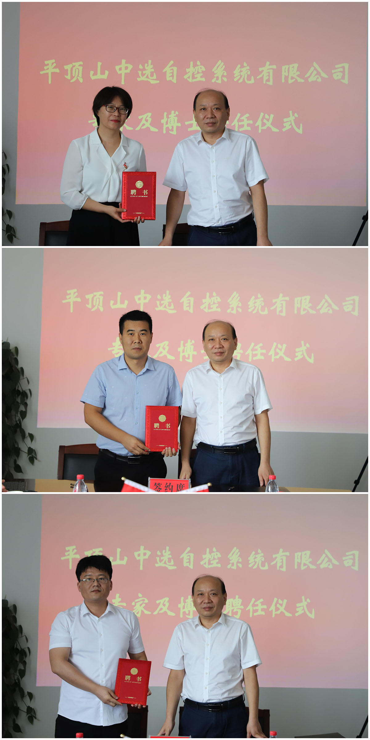 中選自控系統(tǒng)有限公司總經(jīng)理王巍與受聘專家簽署聘任協(xié)議,為董燕飛院長、梁成武博士、司文杰博士頒發(fā)聘任證書。