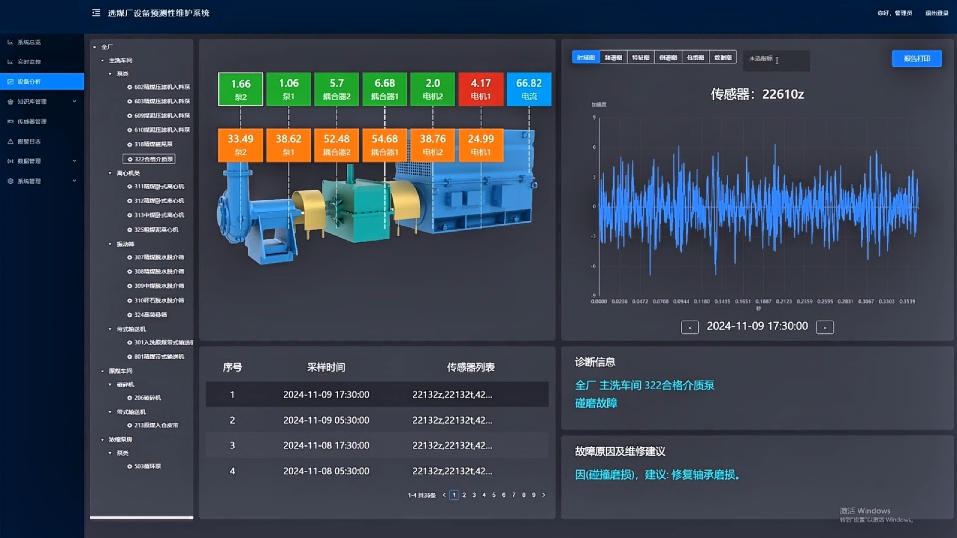 產(chǎn)品簡介:選煤廠設(shè)備預(yù)測性維護(hù)系統(tǒng)實(shí)時采集選煤廠生產(chǎn)設(shè)備的多維數(shù)據(jù)(溫振數(shù)據(jù)、電氣數(shù)據(jù)、設(shè)備實(shí)時數(shù)據(jù)、設(shè)備管理數(shù)據(jù)、音視頻數(shù)據(jù)),利用先進(jìn)數(shù)字信號處理算法、人工智能算法、專家知識庫等方法對設(shè)備進(jìn)行實(shí)時監(jiān)測、故障分析和故障溯源。在設(shè)備出現(xiàn)異常時,能夠分析出異常原因,給出合理維修建議,生成維修報(bào)告并白動推送給檢修人員,指導(dǎo)檢修人員進(jìn)行設(shè)備維護(hù),實(shí)現(xiàn)流程化閉環(huán)管理。選煤廠設(shè)備預(yù)測性維護(hù)系統(tǒng)可早期發(fā)現(xiàn)設(shè)備異常,實(shí)現(xiàn)由“事后維修”向“預(yù)知檢修”的轉(zhuǎn)變,從而實(shí)現(xiàn)設(shè)備維護(hù)安全損失最小、總維護(hù)成本最低、總維修時間最少。
